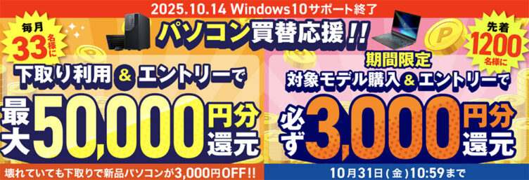 抽選で100人に1人当たる最大全額還元キャンペーン&最大33,000円分のドスパラポイント還元キャンペーンを実施中!