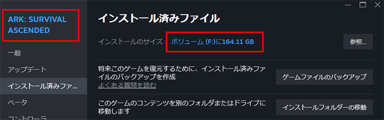 SteamDBのデータによると2025年11月現在のディスク上のサイズは164GBで、DLCも含めると230GBに達します。