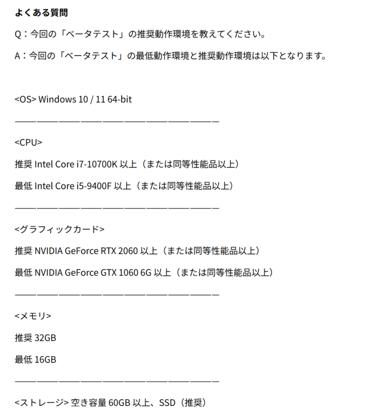 必要スペックとしてはGTX 1060が指定されています。現在のゲーミングPC環境を踏まえると、最低限の構成としてもRTX 3050以上のグラフィックスボードを搭載したモデルを選んでおくと安心です。