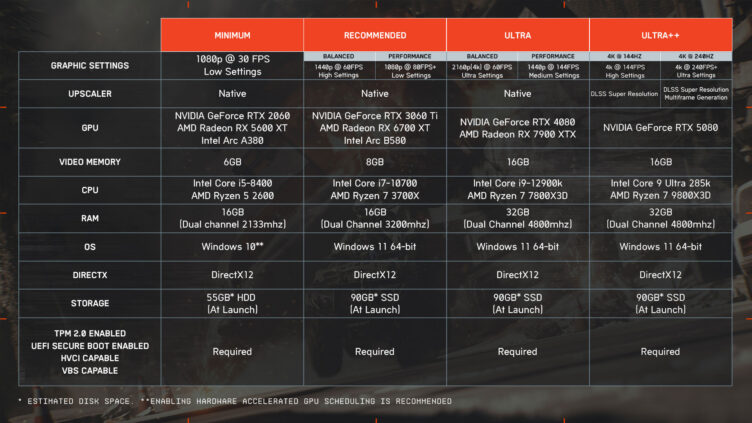 推奨環境では、CPUは8コア以上で、RTX 3060 Ti / RX 6700 XT以上のグラフィックス性能が推奨になります。