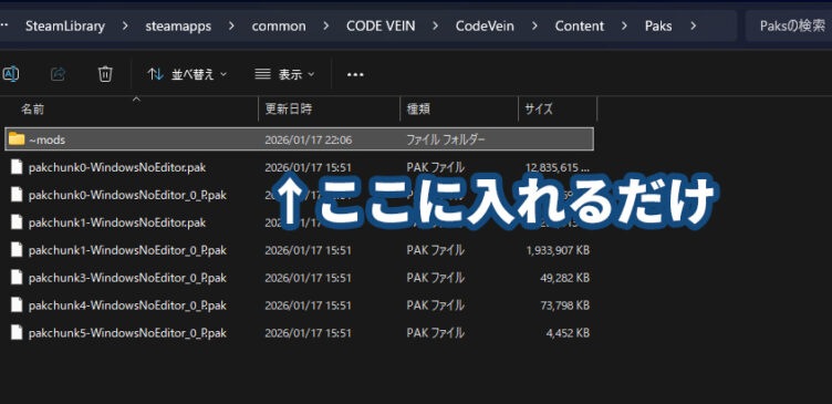コードヴェインの主なMODの導入方法は以下の階層に入れる事です。