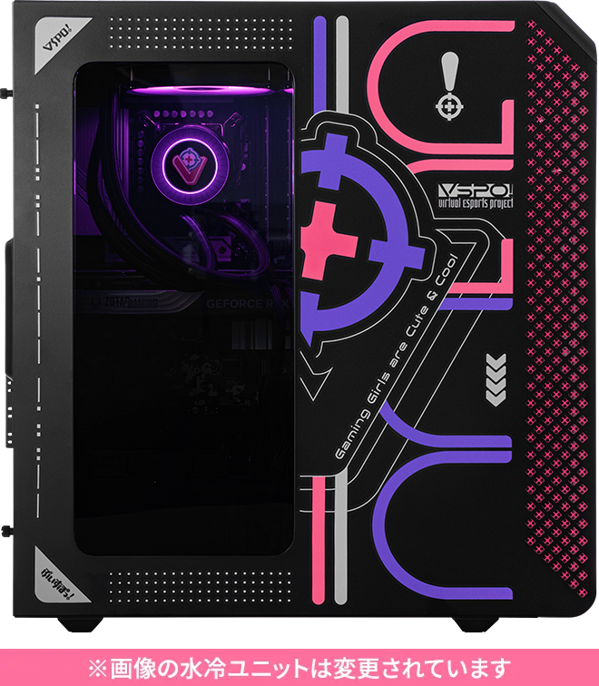 インテリアとしてもなじむ落ち着いた外観に、渋谷ハルをイメージしたカラーでケース全体を照射。上部ボタンでLEDの色を変更でき、ロゴ入りの水冷ヘッドが存在感を放ちます。