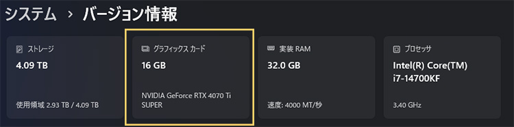 また、すでに使用しているPCのVRAM容量を確認したい場合は、Windowsの設定画面から簡単に確認できます。