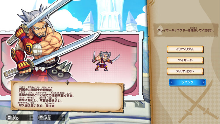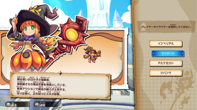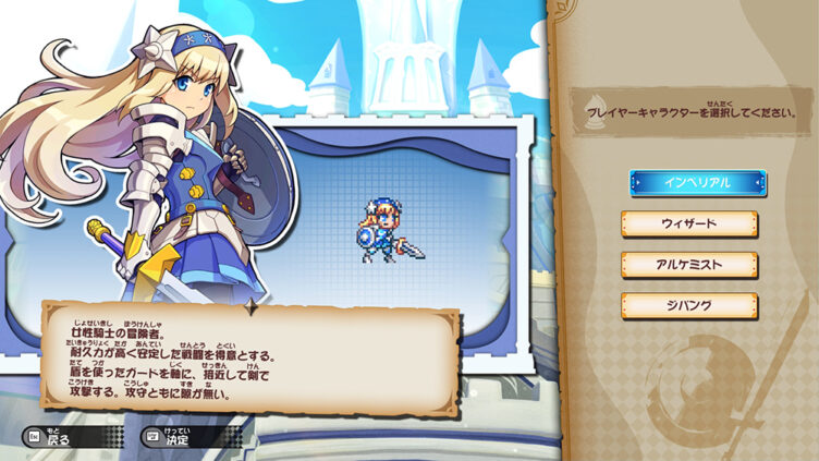操作キャラクターは4人。盾で守る初心者向けの「インペリアル」、遠距離魔法の火力が魅力の「ウィザード」、状態異常で搦め手を使う「アルケミスト」、回避と手数で攻める玄人向けの「ジパング」と、プレイスタイルに合わせて選べます。