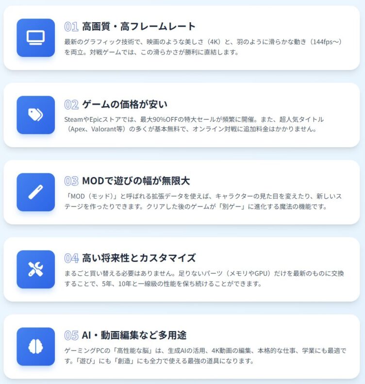ゲーム機は世代交代のたびに買い替えが必要ですが、パソコンならパーツ交換で5年、10年と使い続けることもできます。「今はこのゲームだけ遊べればいいけど、将来的には別のゲームもやりたい」という人にも、柔軟に対応できるのは嬉しいポイントですよね。
