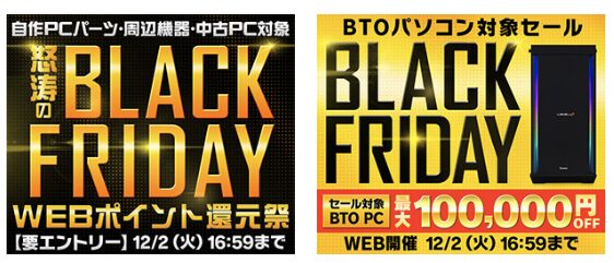 パソコン工房では、「ブラックフライデー」やポイントを還元する「WEBポイント還元祭」が開催中です。
