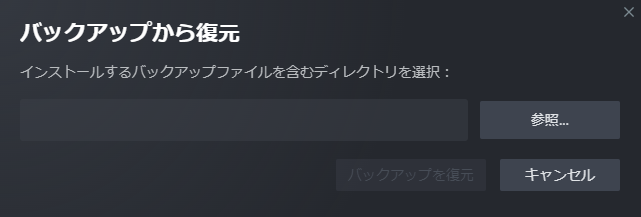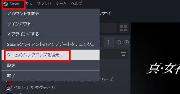 復元するには左上のSteamを押して「ゲームのバックアップを復元」を押します。