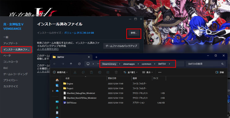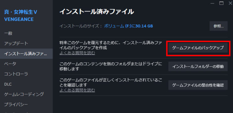 Steamで女神転生5 Vengeanceのプロパティを開き、インストール済みファイルの項目中にある「ゲームファイルのバックアップ」を選択します。