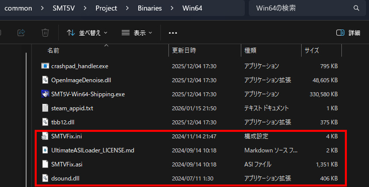 解凍後のフォルダ内に入っているファイルをゲーム本体のWin64フォルダ内に上書きします。