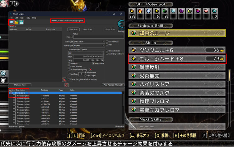 Cheat Engineを起動します。.CTファイル(SMTVV-SKill-Expand.CT) をドラッグ&ドロップでCheat Engineの中に取り込みます。Activeボタンがあるので、押しましょう。