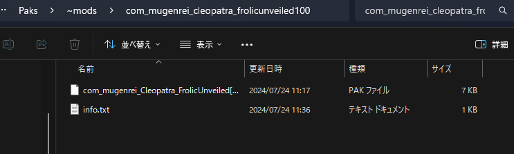 上の画像の階層を見て下さい。「Paks」→「~mods」→「com_mugenrei_cleopatra_frolicunveiled100」になっていると思います。これで導入は成功です。