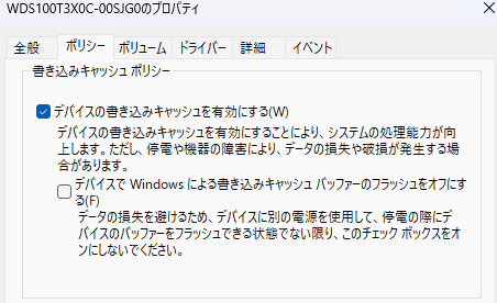 書き込みキャッシュの設定変更は、環境によっては効果がありますが、電源トラブル時のリスク(突然の電源断時にデータ破損のリスクが上がる)や、通常の書き込み速度に影響が出る可能性もあります。試す場合は内容を理解した上で行い、問題があれば元の設定に戻すようにしてください。