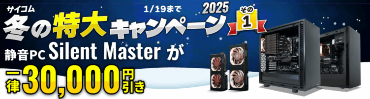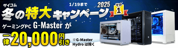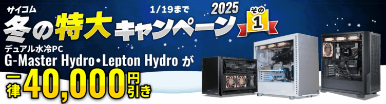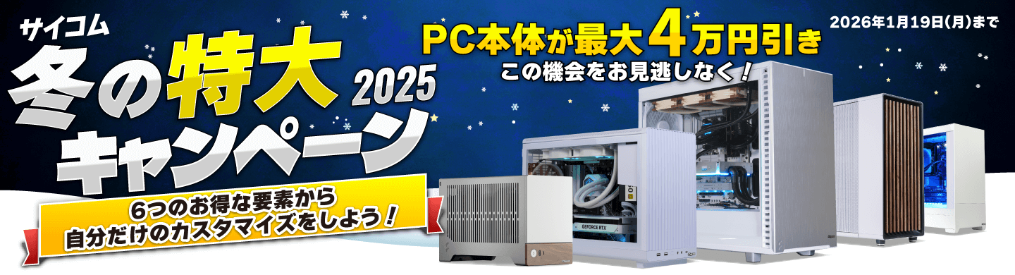 サイコムでは現在、「冬の特大キャンペーン」を開催中です!2026年1月19日までの期間限定で、対象のゲーミングPCが最大4万円OFF。